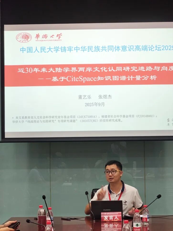 华侨大学马克思主义学院副教授董艺乐以《近30年来大陆学界两岸文化认同研究进路与向度——基于CiteSpace知识图谱计量分析》为题,从文献计量学入手,对大陆学界针对两岸文化认同的研究发展进行了系统梳理。他通过对发文趋势、高频关键词及研究主线的分析,揭示了现有研究热点及未来深化方向,提出了以量化调查与批判性话语构建为突破口的创新性研究路径,强调增强价值认同作为文化认同深化的关键。