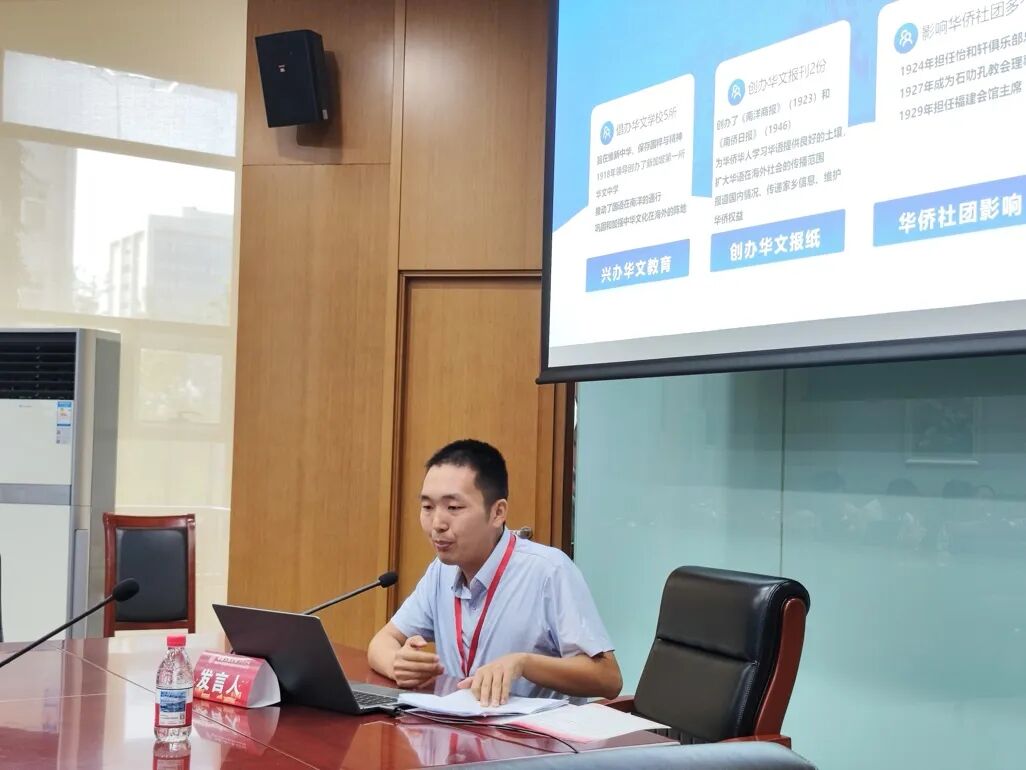 集美大学马克思主义学院讲师刘汇川的报告《陈嘉庚延安之行后的政治转向及构建中华民族共同体意识的海外实践与启示》深入探讨了华侨领袖陈嘉庚在推动中华民族共同体意识方面的实践与贡献,特别是其在华文教育、文化传播以及华侨组织建设中的积极作用,为新时代中华民族共同体建设提供了可借鉴的实践经验。